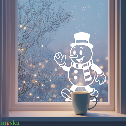 Fehér Cartoony Style sétáló hóember ablakmatrica – fehér öntapadós fóliából, több méretben