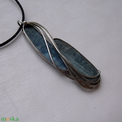 A medál Tiffany technikával készült kianit és ólommentes, ezüsttartalmú ón felhasználásával. A díszítés szintén saját készítésű, nem tartalmaz gyári elemeket. A fémrészt óezüstre patináztam, lekezeltem antioxidánssal és lelakkoztam, hogy sokáig szép maradjon.