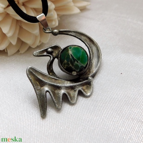 A medál Tiffany technikával készült variszcit (üledéki jáspis) és ólommentes, ezüsttartalmú ón felhasználásával. A díszítés szintén saját készítésű, nem tartalmaz gyári elemeket. A fémrészt óezüstre patináztam és lelakkoztam, hogy sokáig szép maradjon.