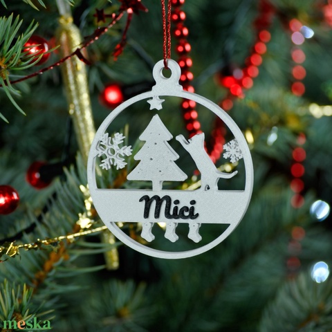 Ez a 8 cm átmérőjű, 3D nyomtatott PLA dísz fehér alapon fekete névvel, cicás, fenyőfás és csillagos mintával készül. Az áttört forma egyedi karaktert ad neki, míg a minőségi, ünnepi szalag segítségével azonnal felakasztható a fára – vagy akár egy ajándékcsomagra.