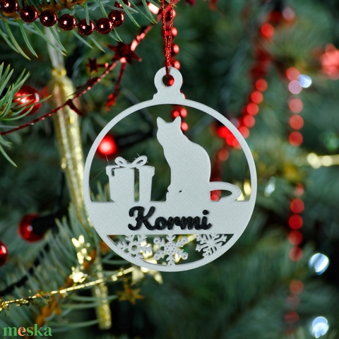 Ez a 8 cm átmérőjű, 3D nyomtatott PLA dísz fehér alapon fekete névvel, cicás, fenyőfás és csillagos mintával készül. Az áttört forma egyedi karaktert ad neki, míg a minőségi, ünnepi szalag segítségével azonnal felakasztható a fára – vagy akár egy ajándékcsomagra.