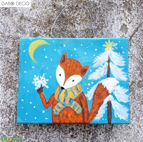 Bohém téli állatos fára festett rusztikus kép. Róka, Nyuszi, Pingvin, Cica, Maci, Kutya