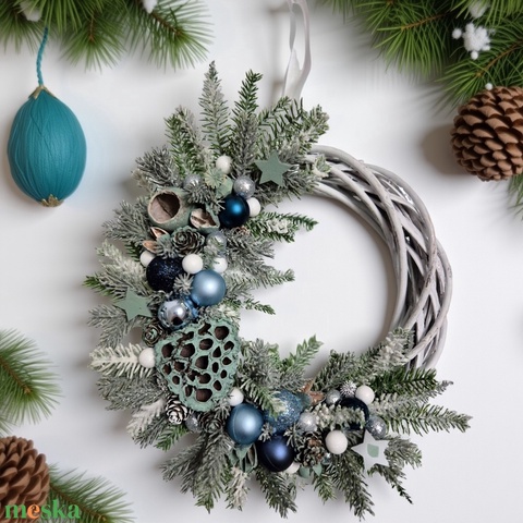 Téli elegancia – kézzel készült kék karácsonyi koszorú