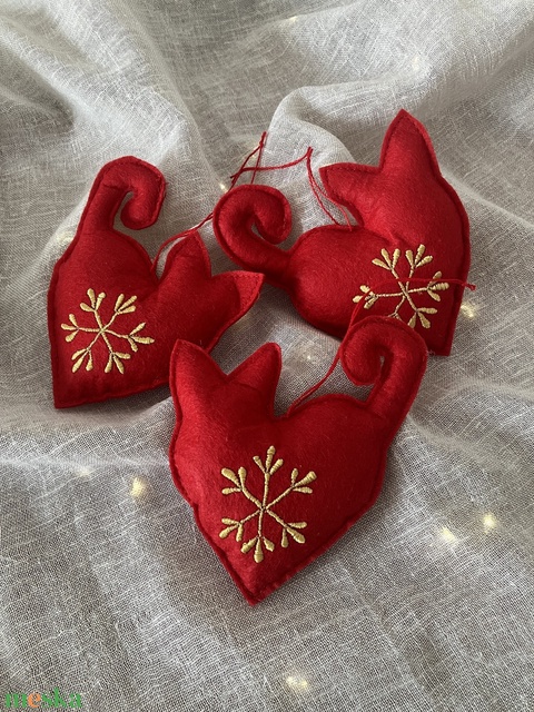 Hímzett macska karácsonyfadísz szív formában – piros textilfilc