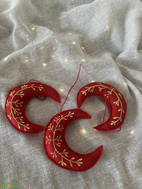 Kézzel hímzett hold karácsonyfadísz – piros textilfilc, arany minta