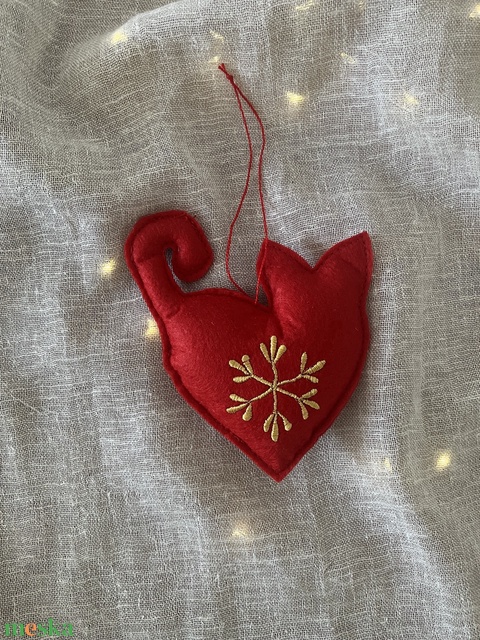 Hímzett macska karácsonyfadísz szív formában – piros textilfilc