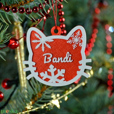 Ez a dísz nem csak cicáknak szól – hanem azoknak is, akik szívükön viselik bundás barátaik nevét. 3D nyomtatással készül, PLA alapanyagból, 8 cm-es méretben. A piros-fehér színvilág ünnepi, mégis modern, a nevet hófehéren emeljük ki rajta. Stílusos akasztószalag is jár hozzá.