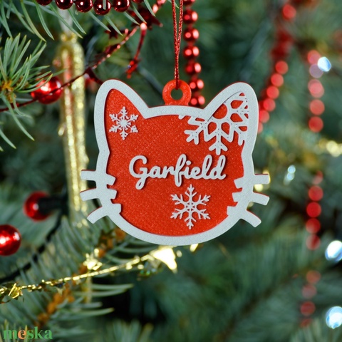 Ez a dísz nem csak cicáknak szól – hanem azoknak is, akik szívükön viselik bundás barátaik nevét. 3D nyomtatással készül, PLA alapanyagból, 8 cm-es méretben. A piros-fehér színvilág ünnepi, mégis modern, a nevet hófehéren emeljük ki rajta. Stílusos akasztószalag is jár hozzá.