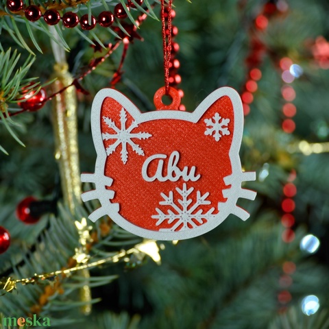 Ez a dísz nem csak cicáknak szól – hanem azoknak is, akik szívükön viselik bundás barátaik nevét. 3D nyomtatással készül, PLA alapanyagból, 8 cm-es méretben. A piros-fehér színvilág ünnepi, mégis modern, a nevet hófehéren emeljük ki rajta. Stílusos akasztószalag is jár hozzá.
