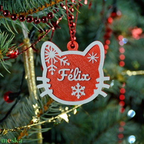Ez a dísz nem csak cicáknak szól – hanem azoknak is, akik szívükön viselik bundás barátaik nevét. 3D nyomtatással készül, PLA alapanyagból, 8 cm-es méretben. A piros-fehér színvilág ünnepi, mégis modern, a nevet hófehéren emeljük ki rajta. Stílusos akasztószalag is jár hozzá.