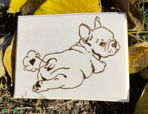 Aranyos francia bulldog névtábla. Pirográffal, préselt fába égetve, 12x16 cm méretben.
