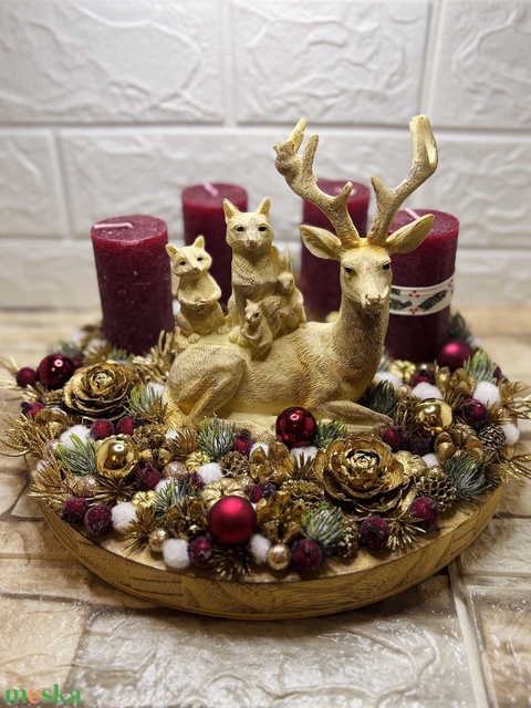 - Anyaga: fa tálca, tűzőhab, gyertya, gyertya tüske, száraz termés, művirág, figura, ragasztó