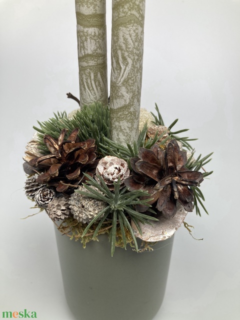 Olívazöld, márványhatású gyertyás, zöld bögrére épült, termésekkel gazdagon díszített tartós adventi asztaldísz (XM5)