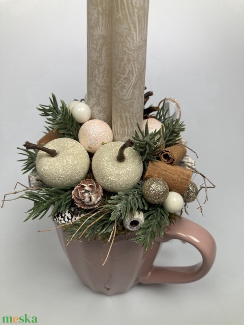 Krémszínű, márványmintás gyertyás, pasztellrózsaszín bögrére épült, gazdagon díszített tartós adventi asztaldísz (XM7)