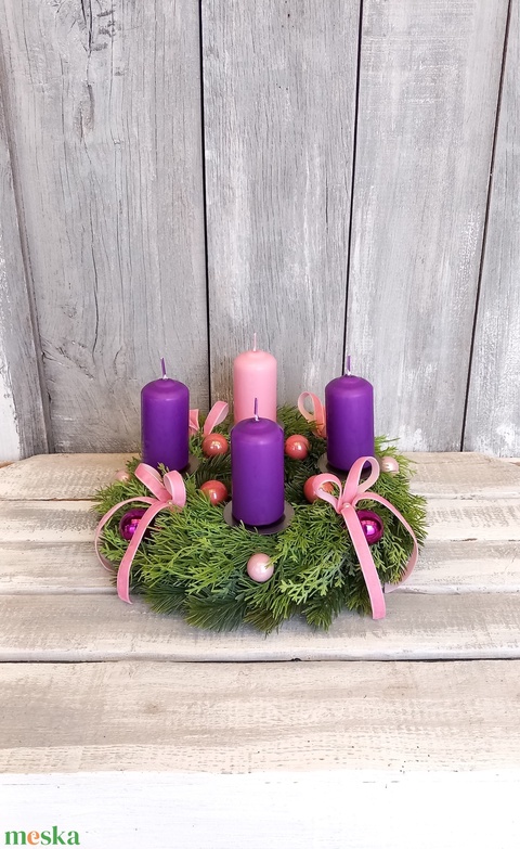 - Anyaga: szalag, gömbök, gyertyák, gyertytartók, műzöldek, szalmaalap