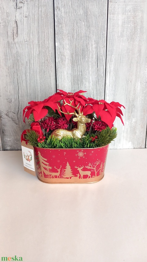 - Anyaga: tűzőhab, műnövények, műbogyók, kaspó, szalag, szarvasdekoráció, selyemvirágok