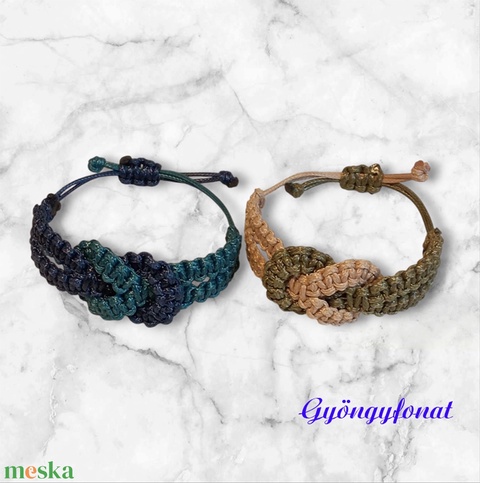 Makramé technikával készítettem ezeket a karkötőket, melyeknek mintás része: kb. 15 cm hosszú. A karkötőket csúszócsomó fogja össze.