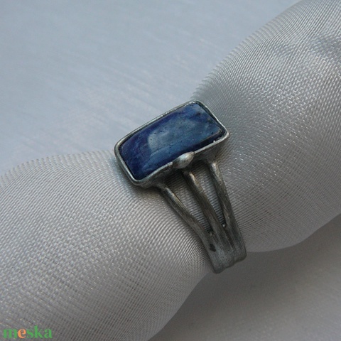 A gyűrű Tiffany technikával készült szodalit és ólommentes, ezüsttartalmú ón felhasználásával. A díszítés szintén saját készítésű, nem tartalmaz gyári elemeket. A fémrészt óezüstre patináztam és lelakoztam, hogy sokáig szép maradjon.