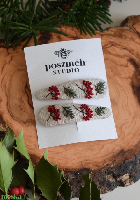 Kézzel hímzett lenvászon hajcsat szett – 2 db karácsonyi kollekció