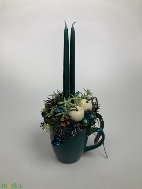 Sötét türkiz bögrére épült, dinnyezöld szálgyertyás, fehér almás, gazdagon díszített tartós adventi asztaldísz (XM10)
