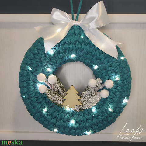 Horgolt, egyedi design karácsonyi ajtódísz - smaragd színben, díszítve