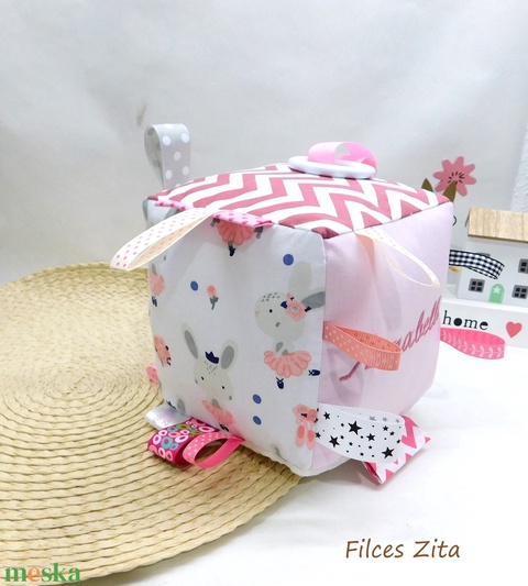 Nyuszis babakocka hímzett névvel - textil címkekocka csörgővel