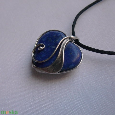 A medál tiffany technikával készült lápisz lazuli és ólommentes, ezüsttartalmú ón felhasználásával. A díszítés szintén saját készítésű, nem tartalmaz gyári elemeket. A fémrészt óezüstre patináztam, lekezeltem antioxidánssal és lelakkoztam, hogy sokáig szép maradjon.