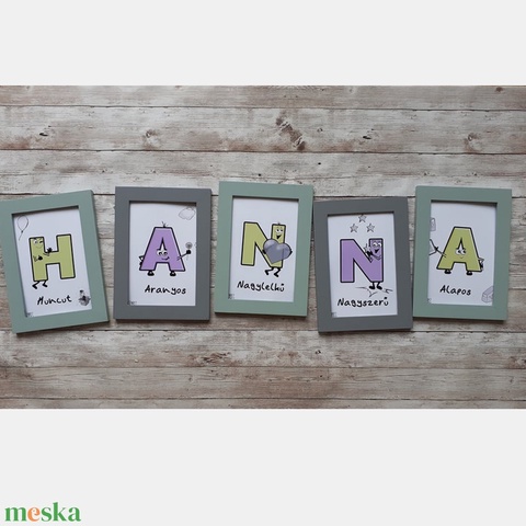 Minden 10x15 cm-es kép egy betűt ábrázol és így betűnként állítható össze a kicsik neve.