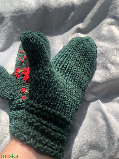 Kesztyű, Kézi kötésű fenyőzöld kesztyű hímzett piros virágokkal eladó