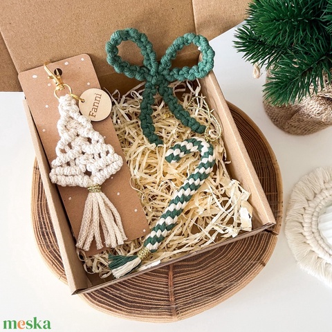 Karácsonyi ajándékcsomag, zöld-natúr színben: Névre szóló fenyőfa kulcstartó, cukorka és masni dísz, ünnepi képeslap
