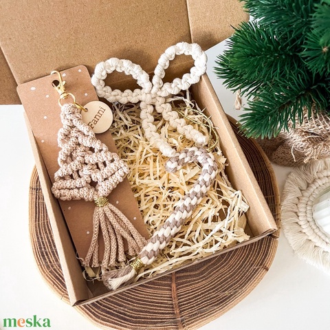 Karácsonyi ajándékcsomag, natúr-bézs színben: Névre szóló fenyőfa kulcstartó, masni és cukorka dísz, ünnepi képeslap