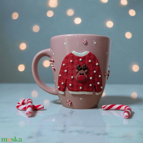 Ronda pulcsis bögre/karácsonyi csupor süthető gyurmával díszítve.
