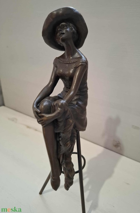 A szobor a klasszikus Art Deco nőalak megtestesítője: kecses, kifinomult és mégis modern. A figura elegánsan ül magas széken, lábát keresztbe teszi, karjával térdére támaszkodik, arcát kissé felfelé fordítja – a tekintetben derű, szabadság és önbizalom. A széles karimájú kalap, a testhez simuló ruha és a finom vonalvezetés mind a 1920-as évek párizsi nőideálját, a „Parisienne” típust idézik: azt a nőt, aki már nemcsak a díszlet része, hanem a modern élet aktív szereplője.