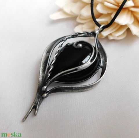 A medál Tiffany technikával készült, ónix, réz és ólommentes, ezüsttartalmú ón felhasználásával. A díszítés szintén saját készítésű, nem tartalmaz gyári elemeket. A fémrészt óezüstre patináztam és lelakkoztam, hogy sokáig szép maradjon.