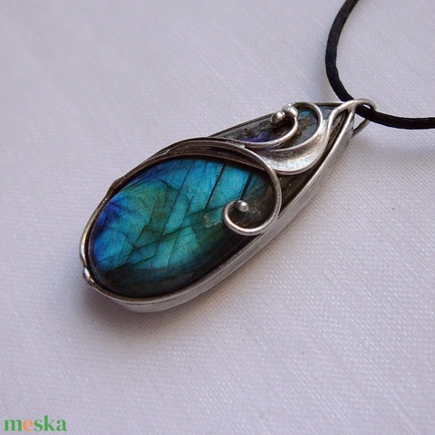 A medál Tiffany technikával készült labradorit és ólommentes, ezüsttartalmú ón felhasználásával. A díszítés szintén saját készítésű, nem tartalmaz gyári elemeket. A fémrészt óezüstre patináztam, lekezeltem antioxidánsal és lelakkoztam, hogy sokáig szép maradjon.