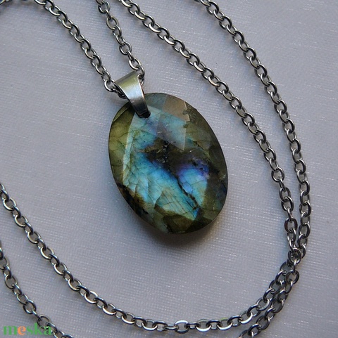Orvosi acél szerelékre akasztottam ezt a különlegesen szép fazettált labradorit medált.