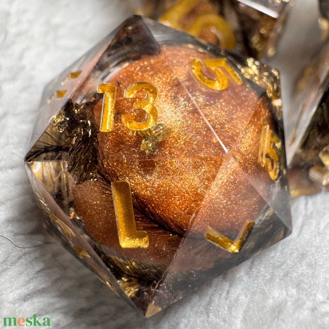 A készlet 7 darab dobókockát tartalmaz, teljes mértékben kézzel készült, így került csiszolásra és polírozásra, új otthonába pedig saját dobozban, meglepetés mini őrző sárkánnyal érkezik!
