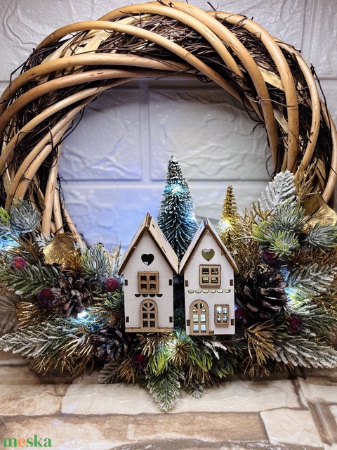 - Anyaga: vessző alap, műfenyő, műnövény, ragasztó, led, fa házikó