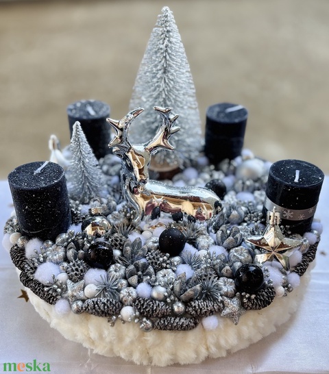 - Anyaga: hungarocell alap, műszőrme, száraz termés, üveg gömb, gyertya, gyertya tüske, metál szarvas, ragasztó, műfenyő