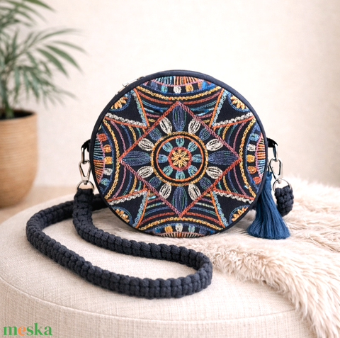 Körtáska, kerek válltáska, geometrikus mintás valódi gobelin szövetből makramé vagy műbőr vállpánttal