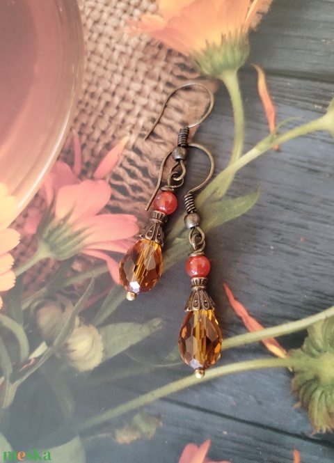 Méz csepp fülbevaló - narancssárga karneol és borostyán sárga üvegcsepp
