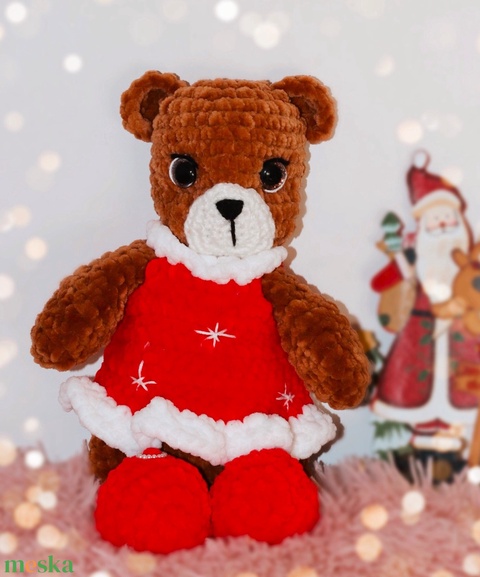 Horgolt karácsonyi maci plüss téli ruhában
