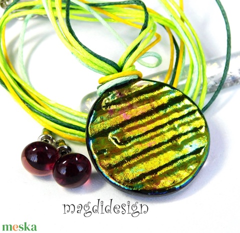 Aranyló zöld-mályva selyemcukor üvegékszer szett nyaklánc stiftes