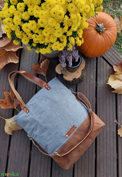 CAPENSIS kollekció - Variálható valódi bőr pántos szürke-camel barna szövettáska
