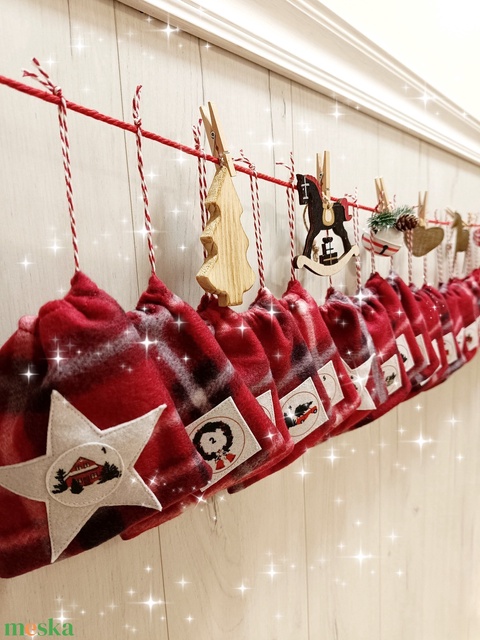 Filc rátéttel zsákokat készítettem puha bordó-szürke kockás polár anyagból. 24 darab bájos zsák, minden képen más, az ünnepre jellemző motívum. Az első, a hatodikat és a 24.-e kapott egy plusz kiemelést, fehér csillagra került a szám. Piros-fehér pékzsineget vartam bele de összehúzva ezzel fel is tudjuk akasztani. 12 ×14 cm-es, több gyerkőcnek is beleférhet apróság. Amit tartalmaz a szett: 24 polár zsák, 3 m piros zsinór, ha felfűznénk. Felár ellenében kérhetsz hozzá 24 darab celofán zacskót, hogy az aszalt gyümi, stb. ne ragadjon bele, könnyű legyen kiemelni. Tehetjük ablak párkányra, polcra, zsinórra fűzve lóghat a falon, kis kampókra is csoportosíthatjuk de ládába pakolva is mutatós lesz. Tehetünk bele sok mindent, főleg gyerekeknek, álljon itt néhány ötlet az édességen kivül: pattogós labda, fa állatkák, zsírkréta, vicces radír, jojó, lego bábu, kártya, pörgettyű, illatos szájfény, pixel hobby kulcstartó készítő szett, kis autó, notesz, apától/anyától egy délutáni program, bábszínházi jegy, matricák, lufi, memori (akár minden nap egy újabb pár), karkötő, játék babaruha, minta lukasztó, hajgumi, iránytű, gumi (ugrálós játékhoz), gyurma, kinyomtatott karácsonyi történet, "cipősdoboz" készítés, látogatás a nagyinál, ajandék készítés rászorulóknak, séta sötétben zseblámpával, teafű fahéjjal, csillagszórózás este az udvaron, ....és még sok minden!