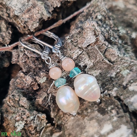 - Anyaga: nemesacél fülbevaló alap, édesvízi tenyésztett gyöngy, nemesacél szerelék, apatit, napkő