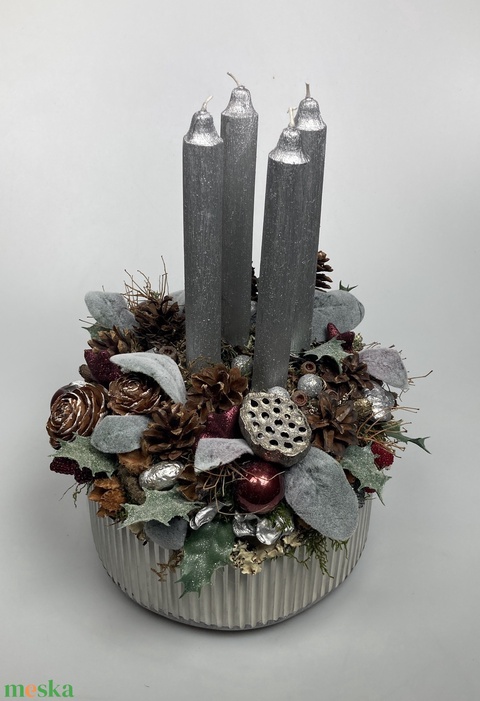Elegáns, ezüst csíkos mázas kerámiatálas, ezüstgyertyás, adventi asztaldísz termésekkel gazdagon díszítve (AW1)