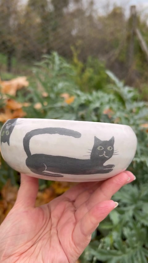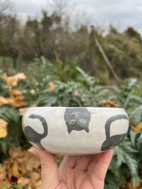 Kézzel festett mély kerámia tál – „Fekete macskák”