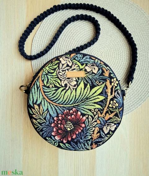 Indás, leveles mintás körtáska, válltáska, valódi gobelin szövetből makramé vagy műbőr vállpánttal