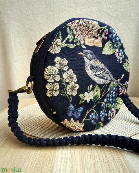 Madár mintás körtáska, válltáska, valódi gobelin szövetből makramé vagy műbőr vállpánttal